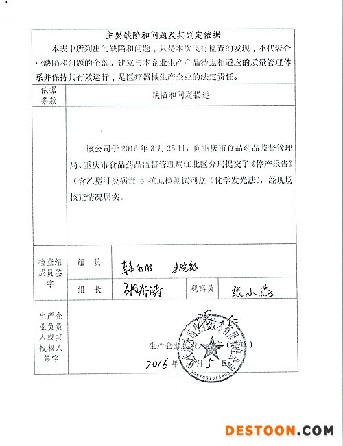 重慶埃夫朗生物技術(shù)有限責(zé)任公司于2016年3月25日向重慶市食品藥品監(jiān)督管理局、重慶市江北區(qū)分局提交了《停產(chǎn)報(bào)告》。經(jīng)檢查組現(xiàn)場(chǎng)核實(shí),該企業(yè)處于停產(chǎn)狀態(tài)。該企業(yè)恢復(fù)生產(chǎn)前應(yīng)當(dāng)按照有關(guān)規(guī)定書面報(bào)告重慶市食品藥品監(jiān)督管理局,經(jīng)重慶市食品藥品監(jiān)督管理局核查符合要求后方可恢復(fù)生產(chǎn)。
