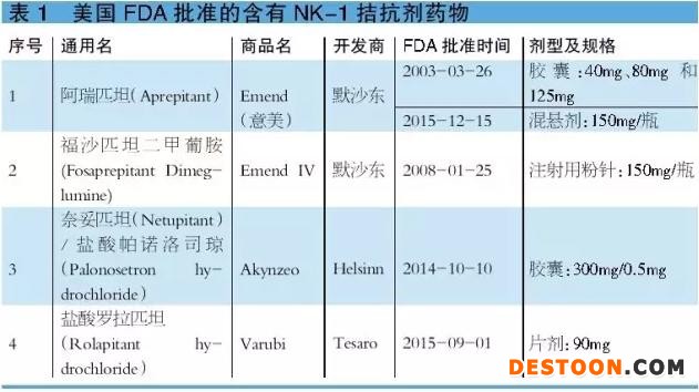 奈妥匹坦/鹽酸帕諾洛司瓊是FDA于2014年10月批準(zhǔn)的用于治療癌癥化療引起的惡心嘔吐類藥物,該藥是由NK-1拮抗劑奈妥匹坦和5-HT3受體拮抗劑鹽酸帕諾洛司瓊組成的復(fù)方制劑,可預(yù)防化療后24小時內(nèi)至12小時產(chǎn)生的惡心嘔吐。