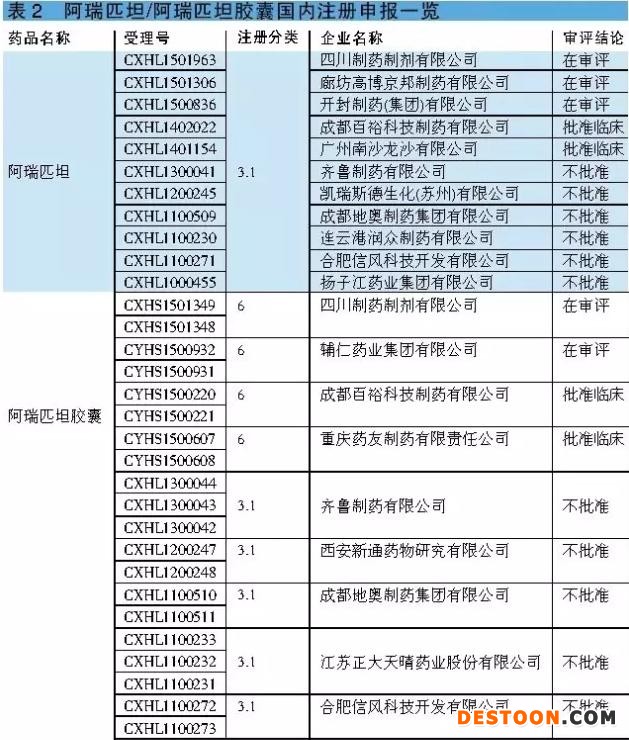阿瑞匹坦尚未實(shí)現(xiàn)國產(chǎn)化。CFDA已于2013年7月22日批準(zhǔn)原研公司的阿瑞匹坦膠囊(商品名:意美)進(jìn)口中國,國內(nèi)該品種市場正處于培育期。迄今,我國已有包括四川制藥制劑和輔仁藥業(yè)等在內(nèi)的多家企業(yè)向CFDA提出有關(guān)阿瑞匹坦膠囊的注冊申請。然而,至今僅成都百裕和重慶藥友獲得臨床批文,包括揚(yáng)子江藥業(yè)、江蘇正大天晴和成都地奧等在內(nèi)的6家企業(yè)的審評結(jié)論均為“不批準(zhǔn)”(詳見表2)??梢?,盡管本品國內(nèi)企業(yè)關(guān)注度頗高,但順利獲得臨床批文的企業(yè)并不多。