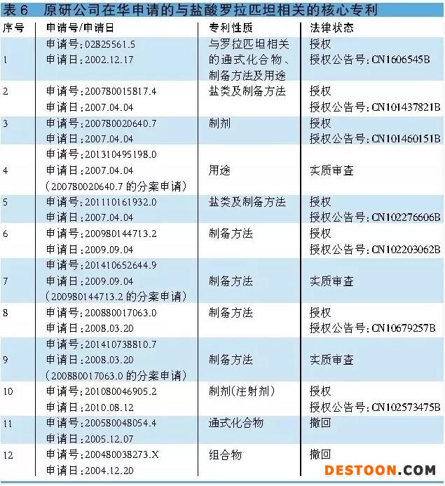 于2007年4月4日申請的200780020640.7是一項(xiàng)與鹽酸羅拉匹坦一水合物相關(guān)的制劑專利,該專利已獲得授權(quán)(授權(quán)公告號:CN101460151B),將于2027年4月4日到期。此外,為獲得更多的專利保護(hù),原研公司在華還申請了與鹽酸羅拉匹坦相關(guān)的制備方法、注射劑等相關(guān)專利(詳見表6)。