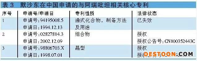 默沙東在華申請了多項(xiàng)與阿瑞吡坦相關(guān)的核心專利(詳見表3)。其中,化合物專利94195008.5已于2014年12月失效,晶型專利98806703.X和組合物專利02827814.3將分別于2018年7月和2022年12月到期。