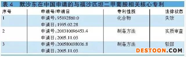 福沙匹坦二甲葡胺相關(guān)的化合物專利95192860.0已于2015年2月失效,而一項(xiàng)與福沙匹坦二甲葡胺制備方法相關(guān)的專利申請200580038036.8已被駁回,另一項(xiàng)專利申請201310096453.4目前處于實(shí)質(zhì)審查階段(詳見表4)。