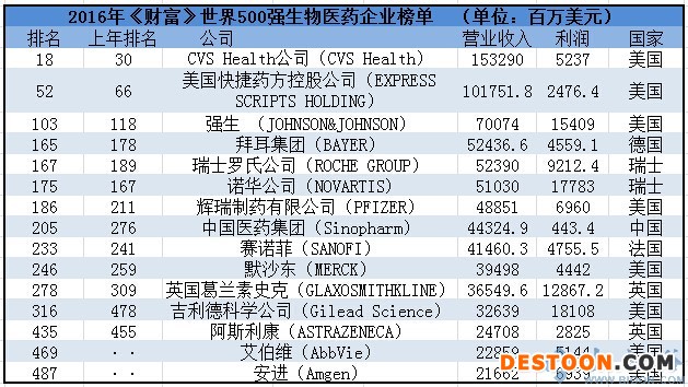 此次世界500強(qiáng)的醫(yī)藥企業(yè)共計(jì)15家,而去年僅有13家,新晉的兩家分別是艾伯維和安進(jìn)。生物谷小編整理了世界500強(qiáng)中醫(yī)藥企業(yè)部分榜單與大家分享。