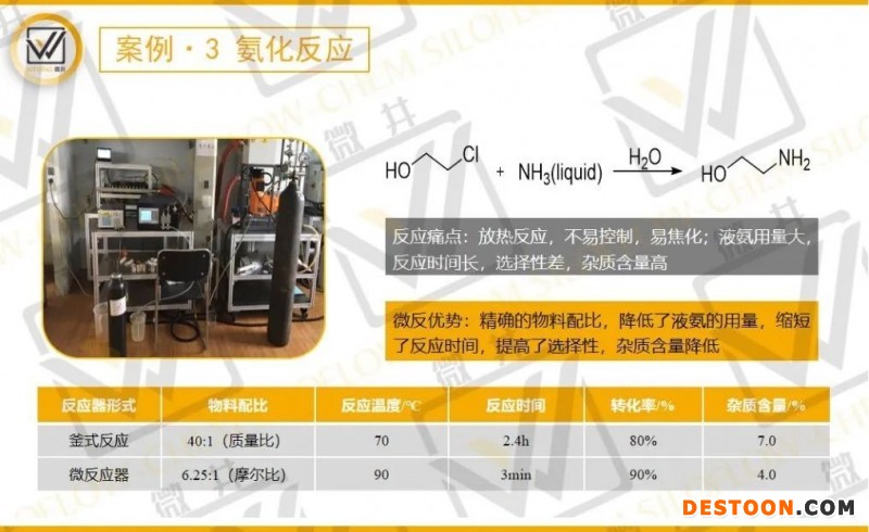 微通道反應(yīng)器的常規(guī)定義是利用精密加工技術(shù)制造的特征尺寸在10-1000μm之間的反應(yīng)器,擁有傳質(zhì)效率高,傳熱效率好,自動(dòng)控制精準(zhǔn),反應(yīng)體積小,放大效應(yīng)小等優(yōu)勢(shì)。微通道反應(yīng)器重點(diǎn)關(guān)注通道設(shè)計(jì)和選擇,并且依據(jù)加工工藝進(jìn)行優(yōu)化設(shè)計(jì)。目前主要含有實(shí)驗(yàn)室、中試撬裝、工業(yè)化撬裝三個(gè)級(jí)別;316L、HC-276、SiC、PTFE常規(guī)材質(zhì),鋯材、蒙乃爾等特需材質(zhì)為依托的產(chǎn)品體系。下面通過(guò)一些案例來(lái)介紹微通道反應(yīng)器的優(yōu)勢(shì)。