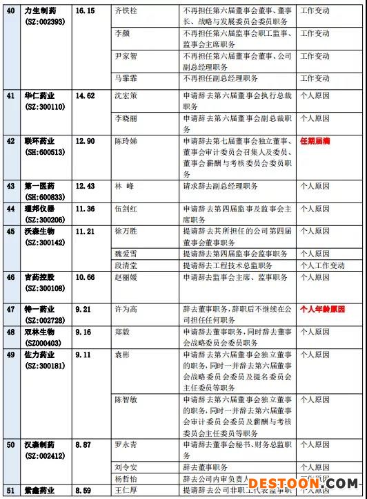其中尤以復(fù)星醫(yī)藥的副總裁職務(wù)和東北制藥的副總經(jīng)理職務(wù)變動最為頻繁——據(jù)不完全統(tǒng)計(jì),半年間,復(fù)星醫(yī)藥的5位高管接連離職;東北制藥的副總經(jīng)理職務(wù)也任期短暫,2月份,路永強(qiáng)被東北制藥董事會解聘副總經(jīng)理職務(wù);4月份,鄭長勝、王浩淼先后因個人原因申請辭去東北制藥副總經(jīng)理職務(wù);5月份,張利東因工作變動不再擔(dān)任東北制藥副總經(jīng)理及財(cái)務(wù)總監(jiān)職務(wù)。
