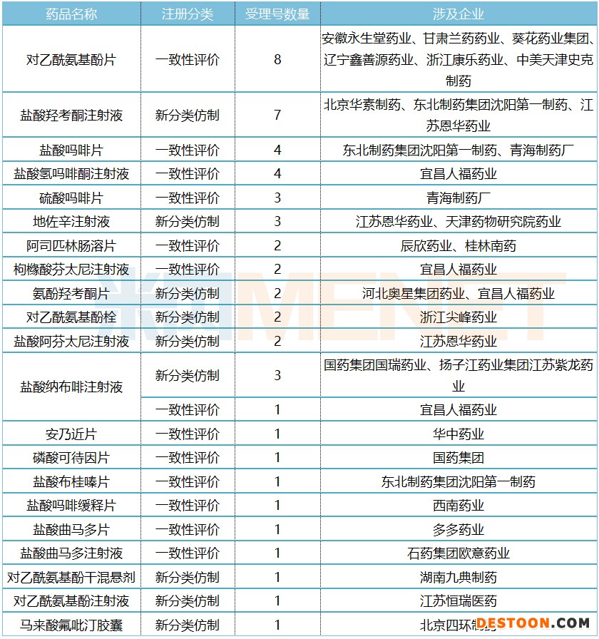截至目前,在審的止痛藥一致性評(píng)價(jià)補(bǔ)充申請(qǐng)及新分類仿制上市申請(qǐng)涉及21個(gè)產(chǎn)品,其中18個(gè)目前暫無(wú)企業(yè)過(guò)評(píng),地佐辛注射液、阿司匹林腸溶片、氨酚羥考酮片、鹽酸納布啡注射液以及鹽酸羥考酮注射液為中國(guó)公立醫(yī)療機(jī)構(gòu)終端TOP10產(chǎn)品。