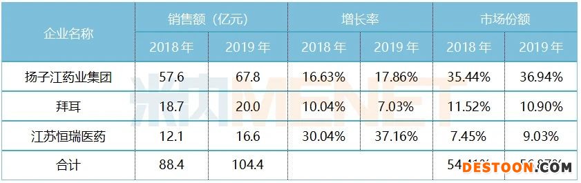 2015-2019年間,“一哥”寶座被揚(yáng)子江穩(wěn)穩(wěn)守住,市場(chǎng)份額從2015年的30.26%一路飆漲至2019年的36.94%;第二家國(guó)內(nèi)藥企恒瑞從2018年起突破10億規(guī)模,2019年上漲至16.6億元,增速超過(guò)37%,是最近幾年的最高值,市場(chǎng)份額也從2015年的5.74%上漲至2019年的9.03%。