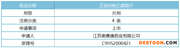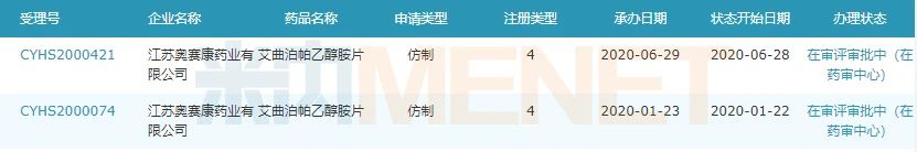 公告中提到,江蘇奧賽康藥業(yè)是該產(chǎn)品國(guó)內(nèi)第一家完成了臨床生物等效性研究遞交生產(chǎn)注冊(cè)申請(qǐng)的企業(yè),米內(nèi)網(wǎng)數(shù)據(jù)顯示,奧賽康分別在2020年1月及6月申報(bào)過艾曲泊帕乙醇胺片的4類仿制上市申請(qǐng),目前兩個(gè)受理號(hào)均在審評(píng)審批中。