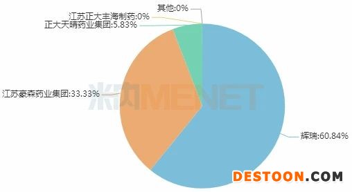 2019年中國公立醫(yī)療機(jī)構(gòu)終端利奈唑胺注射液廠家競爭格局中,原研廠家輝瑞占據(jù)60.84%的市場份額,豪森藥業(yè)以33.33%的市場份額緊接其后,正大天晴以5.83%的市場份額排位第三。