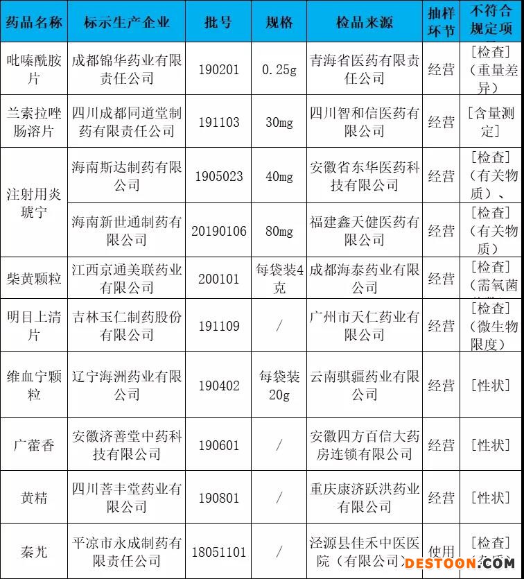 梳理發(fā)現(xiàn),10批次不合格藥品中,有7批次為制劑,分別為吡嗪酰胺片、蘭索拉唑腸溶片、注射用炎琥寧(有2個批次)、柴黃顆粒、明目上清片、維血寧顆粒;3批次為飲片,分別為廣藿香、黃精、秦艽。
