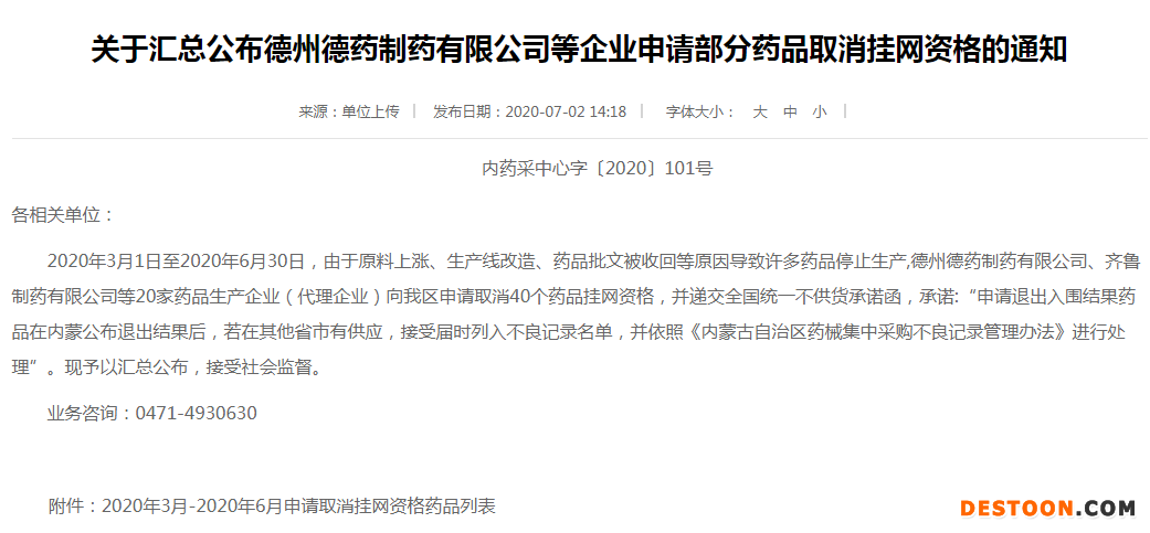 7月2日,內(nèi)蒙古醫(yī)保局掛網(wǎng)《關(guān)于匯總公布德州德藥制藥有限公司等企業(yè)申請部分藥品取消掛網(wǎng)資格的通知》。通知顯示,從2020年3月1日至6月30日,由于原料上漲、生產(chǎn)線改造、藥品批文被收回等原因?qū)е略S多藥品停止生產(chǎn),德州德藥制藥、上?,F(xiàn)代制藥等20家藥品生產(chǎn)企業(yè)(代理企業(yè))向內(nèi)蒙古申請取消40個藥品的掛網(wǎng)資格,并遞交全國統(tǒng)一不供貨承諾函,血塞通、長春西汀等臨床大品種皆在其列。