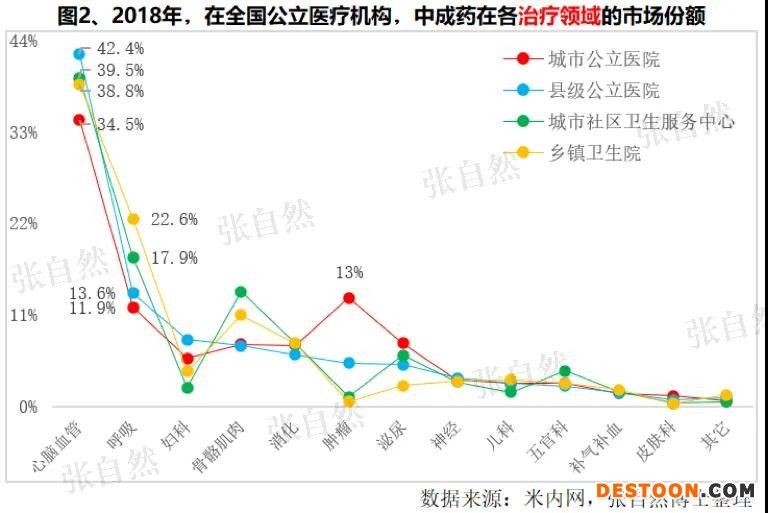 中成藥市場份額較大的另一治療領(lǐng)域是呼吸系統(tǒng),中成藥占比依次是鄉(xiāng)鎮(zhèn)衛(wèi)生院22.6%、城市社區(qū)衛(wèi)生服務(wù)中心17.9%、縣級公立醫(yī)院13.6%和城市公立醫(yī)院11.9%。城市公立醫(yī)院治療腫瘤的中成藥占比最高,是因腫瘤患者多流向大型醫(yī)院所致。