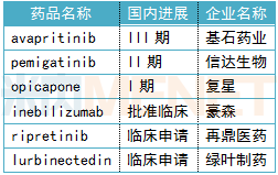 Avapritinib:由藍圖醫(yī)藥開發(fā)研發(fā),于2020年1月獲FDA批準上市,用于治療攜帶血小板衍生生長因子受體α(PDGFRA)基因外顯子18突變(包括PDGFRA D842V突變)的不可切除性或轉移性胃腸道間質瘤(GIST)成人患者。這是全球首款被批準用于治療GIST患者群體的精準療法。對于四線治療的PDGFRA外顯子18突變(包括PDGFRA D842V突變)的不可切除或轉移性GIST患者,對瑞戈非尼等常規(guī)藥物都耐藥,已經無藥可治,Avapritinib有望為這類患者提供一個新的治療選擇。2018年6月,基石藥業(yè)與藍圖醫(yī)藥達成獨家合作及授權協議,推進包括avapritinib在內的三款藥物的單藥或聯合治療在中國大陸及香港、澳門和臺灣地區(qū)的臨床開發(fā)與商業(yè)化。