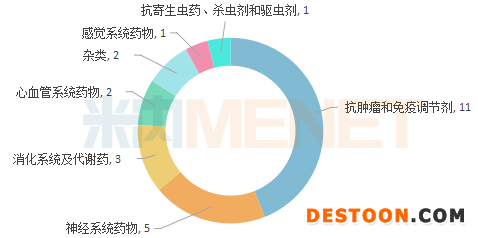 上半年獲得批準的25款新藥,分布在抗腫瘤和免疫調節(jié)劑、神經系統藥物、消化系統及代謝藥、心血管系統藥物、感覺系統藥物和抗寄生蟲藥、殺蟲劑和驅蟲劑等7個治療領域中,排在首位的是抗腫瘤和免疫調節(jié)劑,占據獲批新藥總數的44%。