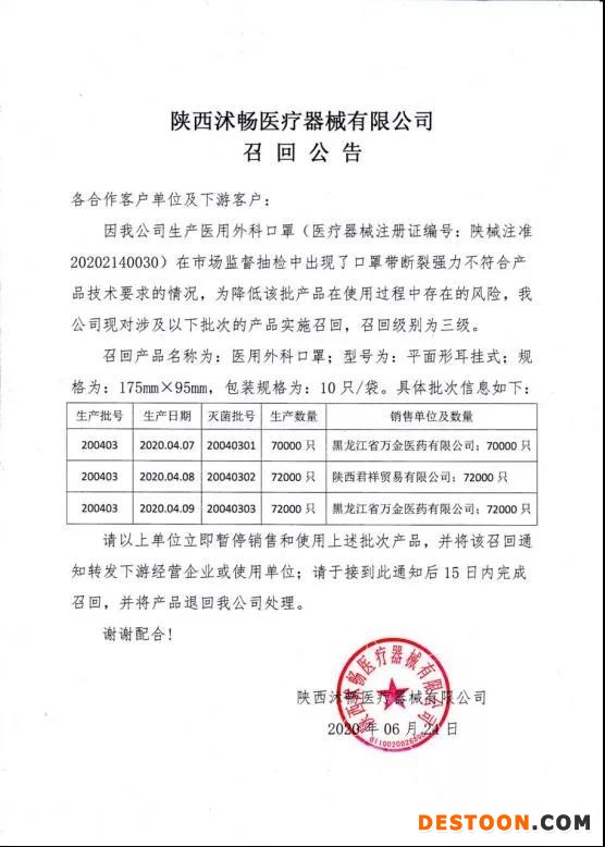公告指出,由于該公司生產(chǎn)的醫(yī)用外科口罩(生產(chǎn)批號200403)口罩帶斷裂強(qiáng)力不符合注冊技術(shù)要求,陜西沭暢醫(yī)療器械有限公司對其生產(chǎn)的醫(yī)用外科口罩(生產(chǎn)批號200403)主動(dòng)召回,召回級別為三級。