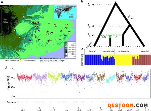 研究同倍體雜交物種形成的難點(diǎn)在于,檢驗(yàn)雜交直接影響生殖隔離的形成。7月6日,中國科學(xué)院西雙版納熱帶植物園副研究員孫永帥研究團(tuán)隊(duì)在Nature Communications發(fā)表了題為Genomic basis of homoploid hybrid speciation within chestnut trees的研究論文。該研究以中國特有的峨眉錐栗研究系統(tǒng)為材料,應(yīng)用進(jìn)化生態(tài)研究方法,發(fā)現(xiàn)了一個(gè)樹木雜交物種以及生殖隔離位點(diǎn)的分布式樣,揭示了自然選擇與重組的互作是塑造生物基因組進(jìn)化的重要機(jī)制。物種形成模型可分為二歧分支式物種形成和雜交物種形成。在二歧分支模型中,每個(gè)物種只對應(yīng)一個(gè)祖先群體,而雜交物種則源自于兩個(gè)或多個(gè)類群。進(jìn)一步地,雜交成種分為多倍體雜交成種和同倍體雜交物種形成。多倍體物種形成較常見于植物界,而同倍體雜交物種形成類群頗為少見,迄今有5個(gè)認(rèn)可度較高的同倍體雜交物種形成類群均分布在美洲?,F(xiàn)存物種及類群間的生殖隔離強(qiáng)度往往高于其祖先群體間的隔離強(qiáng)度。研究團(tuán)隊(duì)將這一原理引入到進(jìn)化生態(tài)學(xué)與交叉研究中,即在與生殖隔離關(guān)聯(lián)的基因組區(qū)域上,現(xiàn)存類群間的基因流應(yīng)低于其祖先群體間的基因流。在生殖隔離位點(diǎn)上,親本物種的等位基因往往因環(huán)境、限制而不能共存?;谶@些原理,該團(tuán)隊(duì)?wèi)?yīng)用群體方法鑒定了中華板栗(也稱板栗)和錐栗的生殖隔離位點(diǎn),進(jìn)而用之檢驗(yàn)峨眉錐栗是否起源于板栗和錐栗間雜交。與此前研究報(bào)道的5個(gè)同倍體雜交成種的實(shí)驗(yàn)設(shè)計(jì)不同,在峨眉錐栗雜交系統(tǒng)中,板栗和茅栗的姐妹種對關(guān)系為鑒定板栗和錐栗的生殖隔離位點(diǎn)提供了天然對照和便利。該研究首先用多個(gè)方法分析峨眉錐栗與板栗、錐栗的遺傳差異,為峨眉錐栗的分類地位提供了證據(jù)。然后,采用hhs方法、溯祖模型比較分析等對峨眉錐栗的雜交起源過程進(jìn)行解析,并估算親本物種對峨眉錐栗基因組的相對貢獻(xiàn)。該研究鑒定了與生殖隔離關(guān)聯(lián)的候選基因組位點(diǎn)。在峨眉錐栗基因組中,僅6個(gè)生殖隔離位點(diǎn)來自于板栗?;蚬δ茏⑨尫治霭l(fā)現(xiàn)兩個(gè)花期關(guān)聯(lián)基因位于本研究鑒定的生殖隔離關(guān)聯(lián)位點(diǎn)上。這些結(jié)果表明,親本物種間生殖隔離位點(diǎn)的重新組合可為新物種形成的重要機(jī)制。研究人員深入分析發(fā)現(xiàn),候選生殖隔離位點(diǎn)偏集中分布于基因組的低重組區(qū)域。研究結(jié)果認(rèn)為,自然選擇和重組間互作塑造了峨眉錐栗基因組的進(jìn)化過程。(100yiyao.com)