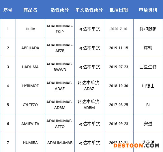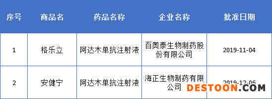 在國(guó)內(nèi)市場(chǎng),也有2款阿達(dá)木單抗生物類似藥已經(jīng)獲批,如下表: