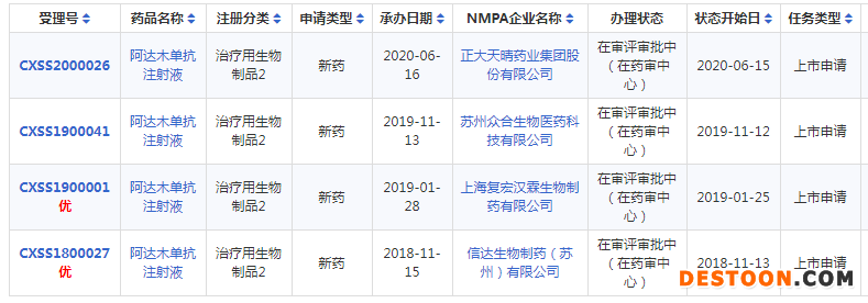 另外,在國(guó)內(nèi),布局阿達(dá)木單抗生物藥的還有很多,其中,正大天晴、君實(shí)生物、復(fù)宏漢霖、信達(dá)4家已經(jīng)申報(bào)上市,如下圖: