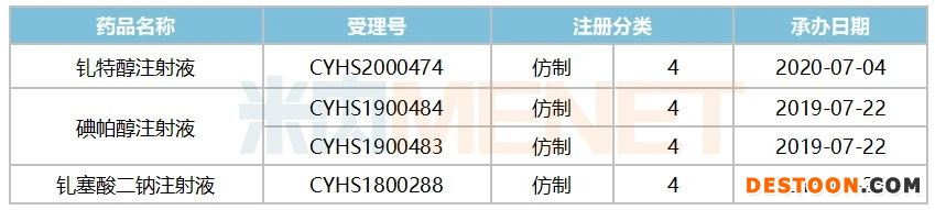 2018年至今,科倫藥業(yè)及子公司共申報(bào)了3個(gè)造影劑產(chǎn)品的上市申請(qǐng),均為4類(lèi)仿制。釓塞酸二鈉注射液是拜耳的原研產(chǎn)品,2019年在中國(guó)公立醫(yī)療機(jī)構(gòu)終端銷(xiāo)售額接近1.6億元,目前僅有正大天晴藥業(yè)集團(tuán)的6類(lèi)仿制獲批,暫無(wú)企業(yè)過(guò)評(píng);碘帕醇注射液是TOP5產(chǎn)品,2019年銷(xiāo)售額超過(guò)11億元,目前獲得國(guó)產(chǎn)批文的企業(yè)有5家,上海司太立制藥與南京正大天晴制藥的4類(lèi)仿制分別于2020年5月、7月獲批并視同過(guò)評(píng)。釓特醇注射液暫無(wú)國(guó)內(nèi)企業(yè)獲批,僅有科倫藥業(yè)申報(bào)上市,奪得首仿幾率較大。