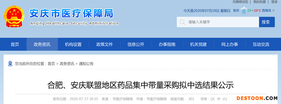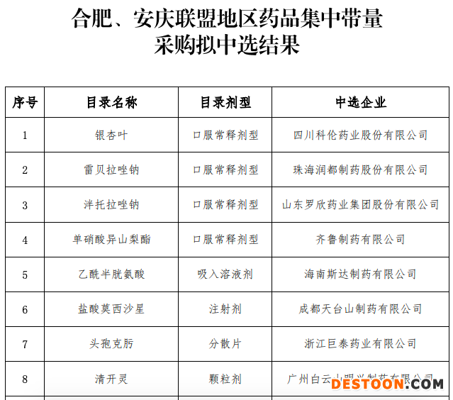 7月17日,安慶市醫(yī)保局正式公示《合肥、安慶聯(lián)盟地區(qū)藥品集中帶量采購(gòu)擬中選結(jié)果》,齊魯、科倫、潤(rùn)都等多家藥企入圍。