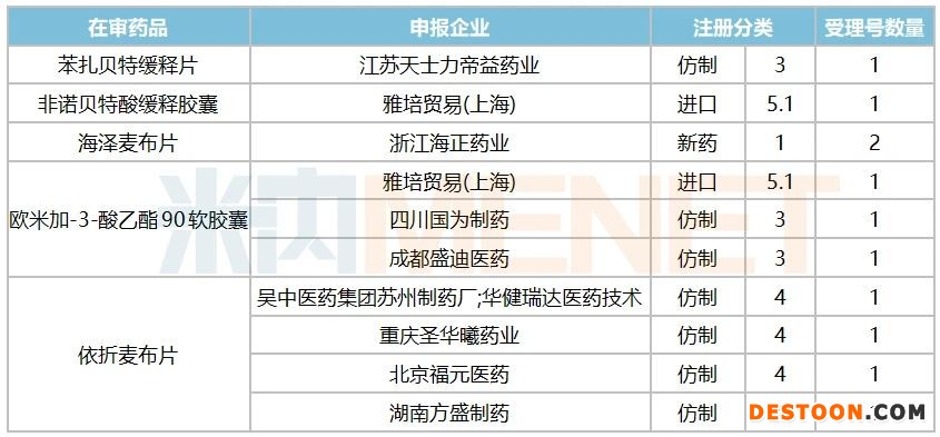 就在大家還沉迷于進(jìn)入他汀類市場(chǎng)分一杯羹的同時(shí),一批國(guó)內(nèi)研發(fā)實(shí)力較強(qiáng)的藥企已經(jīng)把目光放到其他血脂調(diào)節(jié)劑新品上了,2019年至今共有5個(gè)非他汀類產(chǎn)品的上市申請(qǐng)?jiān)趯彛ㄉ婕?1個(gè)受理號(hào)),其中包括了1個(gè)1類新藥,3個(gè)產(chǎn)品的國(guó)內(nèi)首仿之爭(zhēng)也進(jìn)入了白熱化階段。