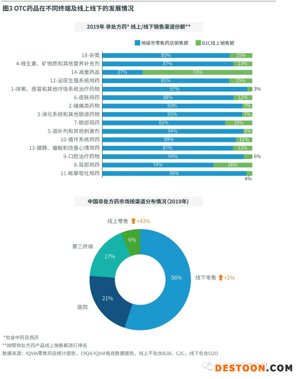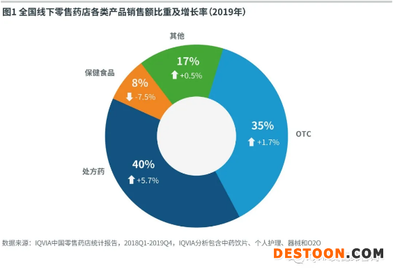 如果再加上中藥飲片、個(gè)人護(hù)理和器械,則2019年線下零售藥店整體規(guī)模約為3711億元。值得一提的是,受醫(yī)保政策限制非藥品類在藥店銷售和帶量采購(gòu)政策推行、處方外流的影響,第二終端的藥品銷售占比持續(xù)提升——OTC和處方藥占據(jù)線下藥店整體市場(chǎng)的75%。(參見圖1)