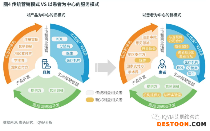 當(dāng)然,無(wú)論政策和環(huán)境發(fā)生怎樣的變化,零售渠道都將成為醫(yī)藥分業(yè)的最終受益者,但這個(gè)渠道紅利需要配合服務(wù)模式的轉(zhuǎn)變——傳統(tǒng)的營(yíng)銷模式已經(jīng)不能滿足市場(chǎng)需求,未來(lái)以患者為中心的服務(wù)模式將成為主流,特別是疫情之下凸顯了互聯(lián)網(wǎng)診療帶來(lái)的藥品零售新機(jī)會(huì)。零售企業(yè)應(yīng)主動(dòng)參與提升數(shù)字化的患者管理和服務(wù)能力。未來(lái),醫(yī)藥零售的生意模式將是數(shù)據(jù)驅(qū)動(dòng)的線上線下融合,批發(fā)、零售和互聯(lián)網(wǎng)平臺(tái)的界限將被打通,并出現(xiàn)依托大連鎖或大平臺(tái)的數(shù)字商業(yè)體。(參見圖3、4)