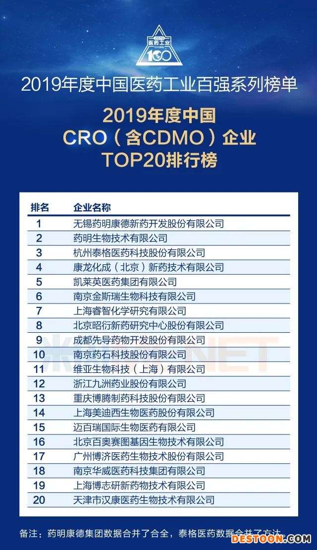 在2019年度中國CRO(含CDMO)企業(yè)TOP20排行榜中,藥明康德、藥明生物、泰格醫(yī)藥位列前三甲;