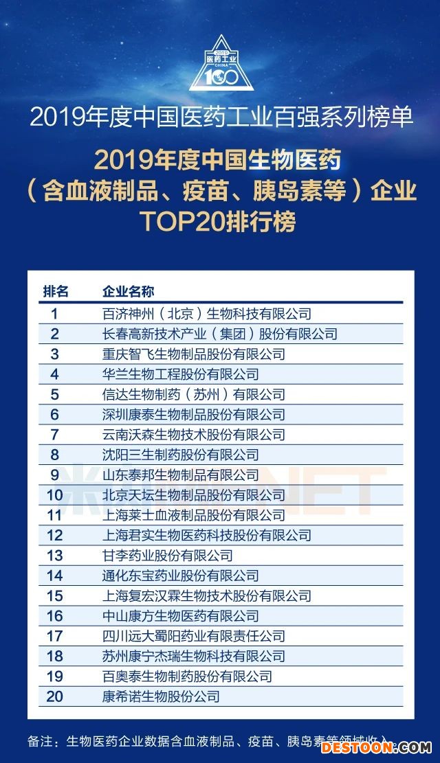 在2019年度中國生物醫(yī)藥(含血液制品、疫苗、胰島素等)企業(yè)TOP20排行榜中,百濟(jì)神州、長春高新、智飛生物位列前三甲。