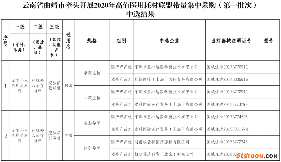 7月23日,云南省曲靖市牽頭開展2020年第一批公立醫(yī)療機(jī)構(gòu)高值醫(yī)用耗材聯(lián)盟帶量集中采購(gòu)(第一批次)中選結(jié)果公布。
