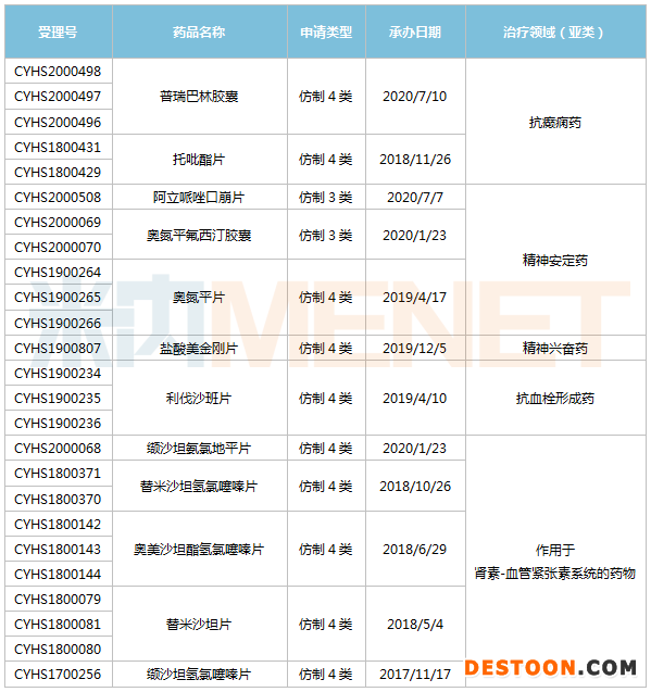 從治療類別看,華海藥業(yè)在審仿制藥主要布局心腦血管用藥、神經(jīng)系統(tǒng)藥物等領(lǐng)域。其中,作用于腎素-血管緊張素系統(tǒng)的藥物有6個品種,精神安定藥有3個品種,抗癲癇藥有2個品種。