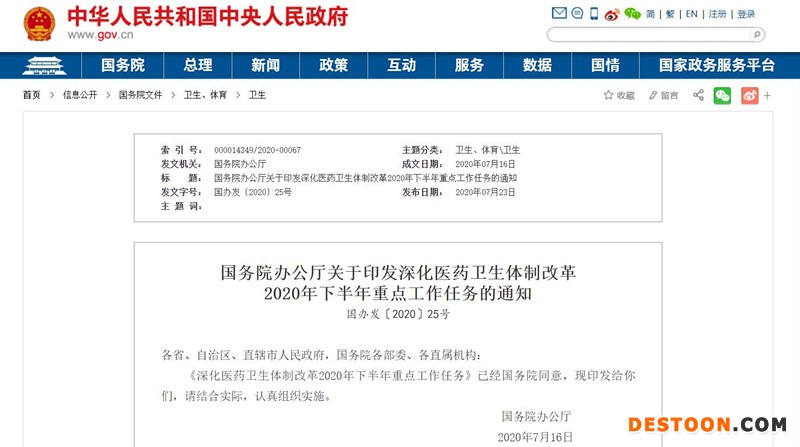 醫(yī)藥網(wǎng)7月24日訊 7月23日,國(guó)務(wù)院辦公廳印發(fā)《深化醫(yī)藥衛(wèi)生體制改革2020年下半年重點(diǎn)工作任務(wù)》,其中提到了加強(qiáng)公共衛(wèi)生體系建設(shè)、深入實(shí)施健康中國(guó)行動(dòng)、深化公立醫(yī)院綜合改革、健全藥品供應(yīng)保障體系……