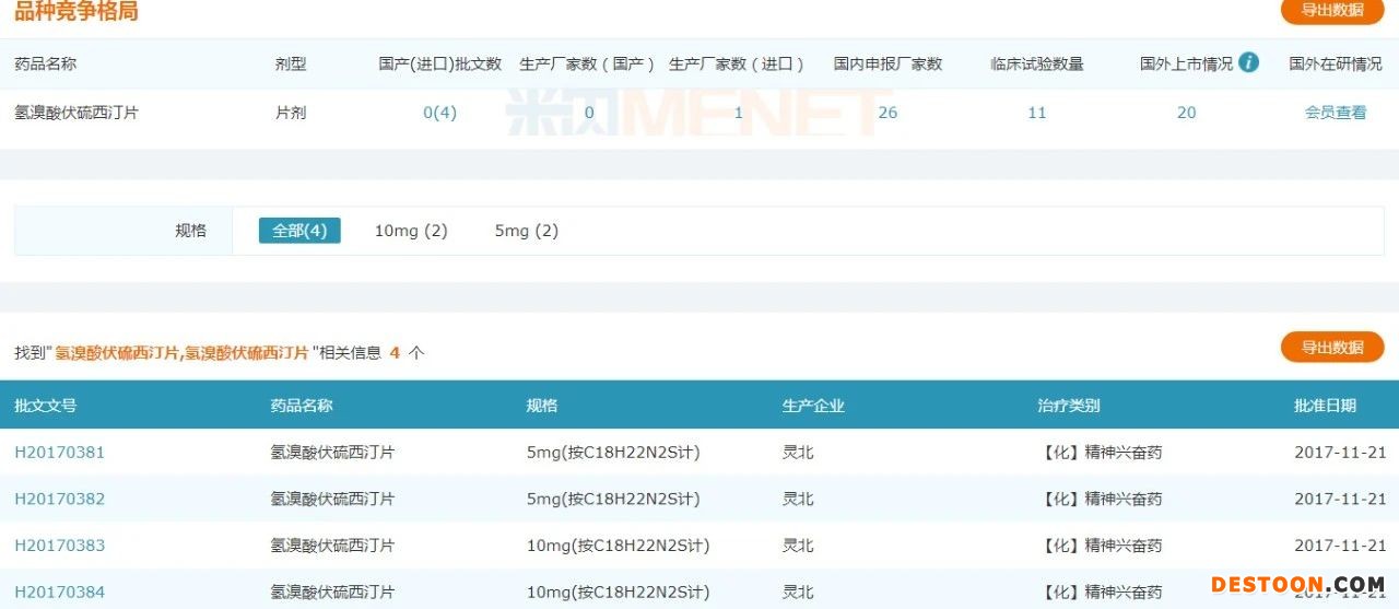 7月24日,CDE官網(wǎng)顯示,成都倍特藥業(yè)的氫溴酸伏硫西汀片4類(lèi)仿制上市申請(qǐng)獲得受理。米內(nèi)網(wǎng)數(shù)據(jù)顯示,2019年中國(guó)公立醫(yī)療機(jī)構(gòu)終端伏硫西汀片劑銷(xiāo)售額3086萬(wàn)元,生產(chǎn)企業(yè)僅有靈北一家。在此之前,揚(yáng)子江和正大天晴藥業(yè)集團(tuán)分別以仿制3類(lèi)、4類(lèi)提交上市申請(qǐng),在審評(píng)審批中(在藥審中心)。