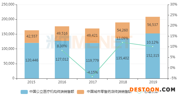 圖:2015-2019年中國(guó)公立醫(yī)療機(jī)構(gòu)及城市零售藥店終端替米沙坦銷售情況(單位:萬(wàn)元)
