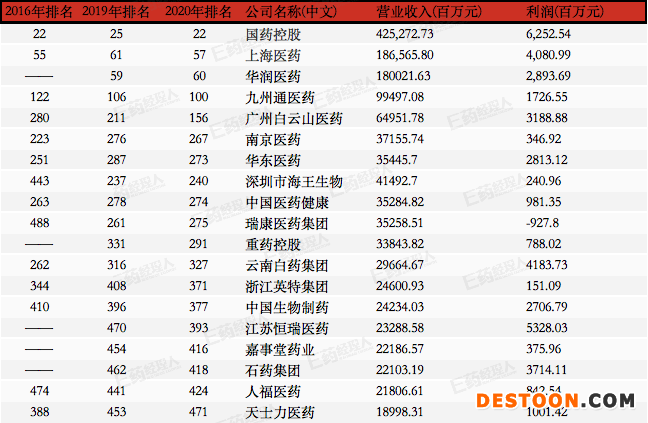 中國生物制藥從2016年的410名提升至377名。恒瑞和石藥集團(tuán)則是500強(qiáng)的新秀,兩者均是2019年入圍。恒瑞2019年入圍時(shí)排名為470,2020年排名迅速攀升54位,達(dá)416名。石藥集團(tuán)2019年入圍時(shí)排名為462名,今年已經(jīng)躍居至418名,排名上升44位。