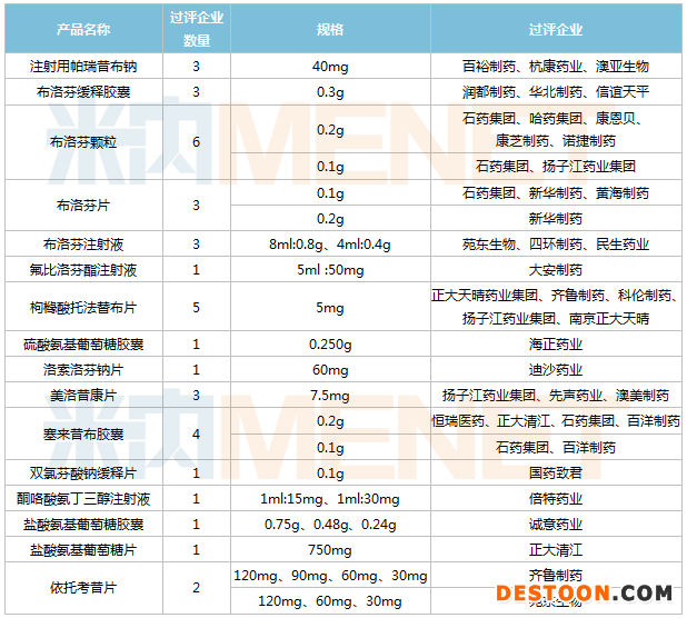 米內(nèi)網(wǎng)一致性評價數(shù)據(jù)庫顯示,截至7月28日,抗炎藥和抗風濕藥已有16個品種(54個品規(guī))通過/視同通過一致性評價,布洛芬顆粒、枸櫞酸托法替布片、塞來昔布膠囊等熱門品種過評企業(yè)數(shù)量最多。