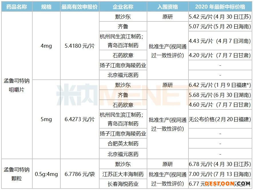 2019年中國公立醫(yī)療機(jī)構(gòu)終端阻塞性氣管疾病用藥內(nèi)服品牌中,默沙東的孟魯司特系列占領(lǐng)了絕對的高地,三大產(chǎn)品合計(jì)接近19億元。第一輪國家集采時,孟魯司特鈉片入選,4+7試點(diǎn)由杭州民生濱江制藥中標(biāo)(3.88元/片),隨后聯(lián)盟擴(kuò)圍階段,默沙東同樣降價至3.88元/片,與杭州民生濱江制藥(3.79元/片)分享市場。受降價影響,默沙東的孟魯司特鈉片銷售下滑14%,杭州民生濱江制藥的孟魯司特鈉片則直接擠進(jìn)內(nèi)服品牌TOP7。第三輪國家集采如箭在弦,孟魯司特鈉咀嚼片(4mg、5mg)、孟魯司特鈉顆粒(0.5g:4mg)均已入選,默沙東要面對的強(qiáng)勁對手包括了石藥歐意、齊魯、揚(yáng)子江等8家國內(nèi)明星藥企,此番價格戰(zhàn)可見相當(dāng)慘烈。