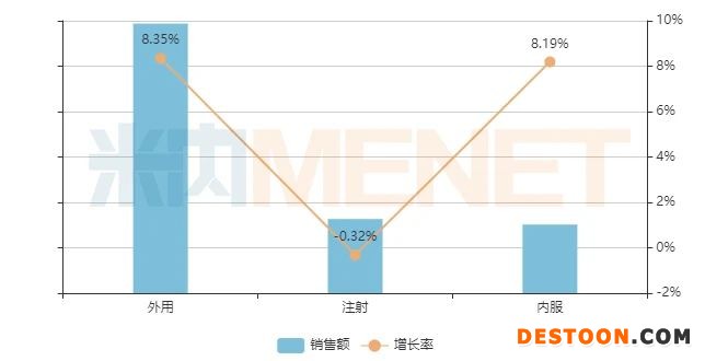從用藥途徑來看,外用占比最大,從2015年的61.38%上漲至2019年的65.38%,2016-2018年增速均超過15%,2019年則僅有8.35%;注射的占比則從2015年的22.15%下滑至2019年的17.99%,2019年增速首次負(fù)增長;內(nèi)服占比保持在16%左右,2016-2018年增速均超過10%,2019年則為8.19%。