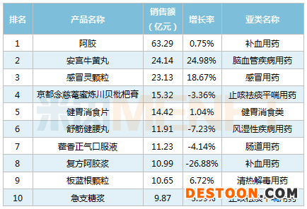 2019年中國城市零售藥店終端中成藥產(chǎn)品TOP10中,9個(gè)產(chǎn)品的銷售額超過10億元,阿膠以63.29億元的銷售額遙遙領(lǐng)先;安宮牛黃丸以24.98%的銷售增長率領(lǐng)跑,復(fù)方阿膠漿的銷售額大跌26.88%。