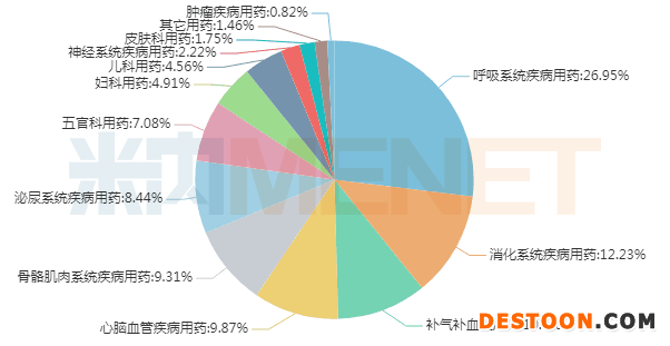 中成藥涵蓋13個(gè)治療大類,零售市場中呼吸系統(tǒng)疾病用藥獨(dú)占鰲頭,占據(jù)26.95%的市場份額,消化系統(tǒng)疾病用藥、補(bǔ)氣補(bǔ)血類用藥則位列第二、第三。
