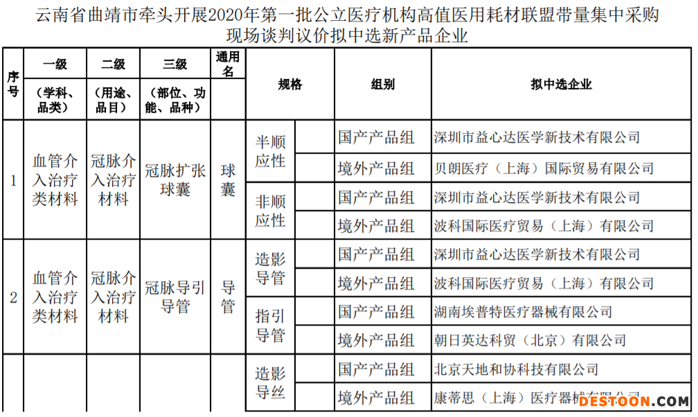 據(jù)了解,7月13日云南省曲靖市醫(yī)用耗材聯(lián)合采購(gòu)辦公室發(fā)布公示,已完成2020年第一批公立醫(yī)療機(jī)構(gòu)高值醫(yī)用耗材聯(lián)盟帶量集中采購(gòu)第一批次現(xiàn)場(chǎng)談判議價(jià)。