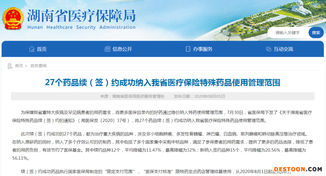 根據(jù)湖南省醫(yī)保局公布的消息,此次續(xù)(簽)約成功的27個藥品,涉及非小細(xì)胞肺癌、多發(fā)性骨髓瘤、淋巴瘤、白血病、前列腺癌和肺動脈高壓等治療領(lǐng)域。其中續(xù)約品種12個,平均降幅為11.47%,最高降幅為32%;新納入簽約品種15個,平均降幅為20.56%,最高降幅為56.11%。