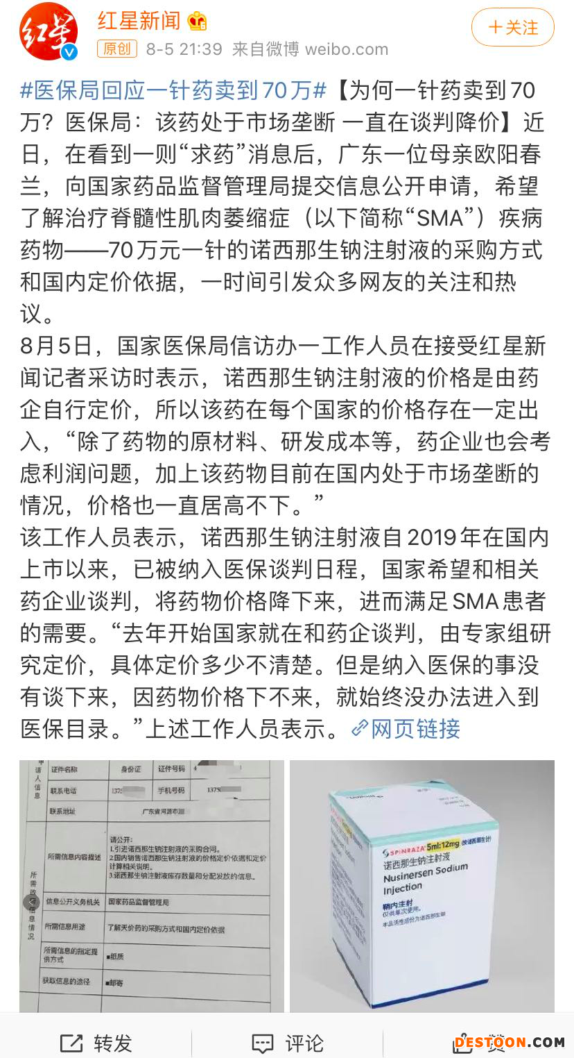 據(jù)紅星新聞報(bào)道,廣東一位母親,向國家藥監(jiān)局提交信息公開申請,希望了解70萬元一針的諾西那生鈉注射液的采購方式和國內(nèi)定價(jià)依據(jù),引發(fā)網(wǎng)友的關(guān)注和熱議。
