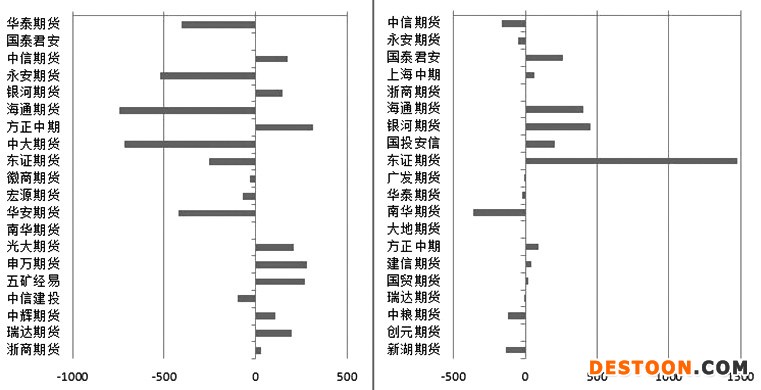 相反,方正中期席位當(dāng)日在增持314張多單的同時(shí)增持92張空單,凈多單增加至589張;浙商期貨席位在多頭持倉上的增持幅度亦大于在空頭持倉上的增持幅度;南華期貨席位雖做出多、空同減操作,但在減持4張多單的同時(shí)減持361張空單,凈空單減少至1463張。以上數(shù)據(jù)顯示,這部分席位對(duì)后市更傾向于樂觀。