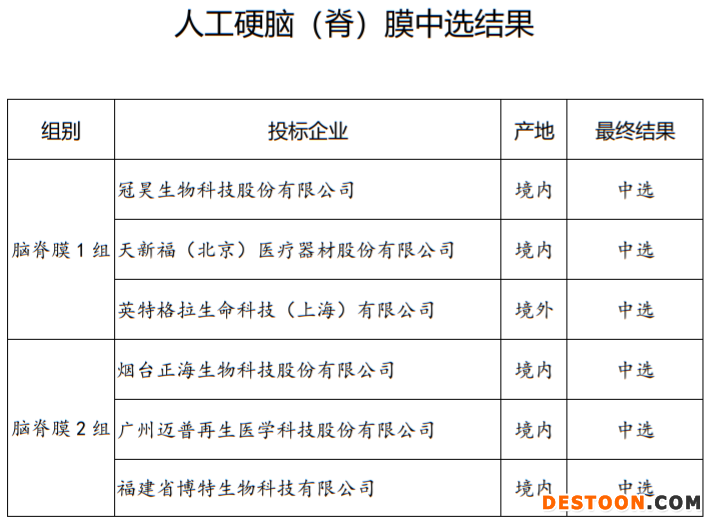 人工硬腦(脊)膜中選企業(yè)包括冠昊生物、天新福(北京)醫(yī)療器材、英特格拉生命科技等械企;