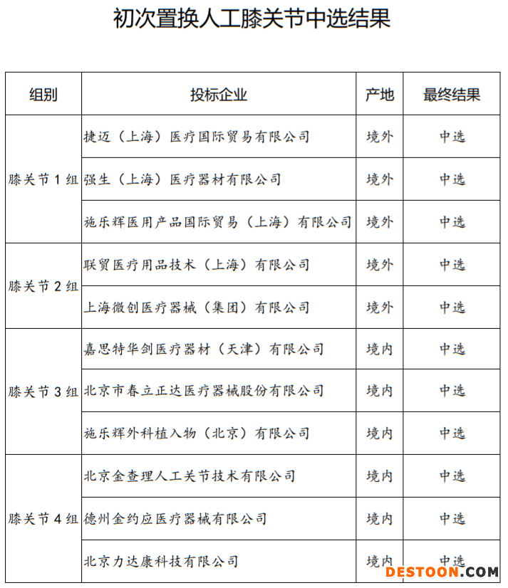 根據(jù)公告,初次置換人工膝關(guān)節(jié)中選企業(yè)包括強(qiáng)生、捷邁、施樂(lè)輝、上海微創(chuàng)等械企;