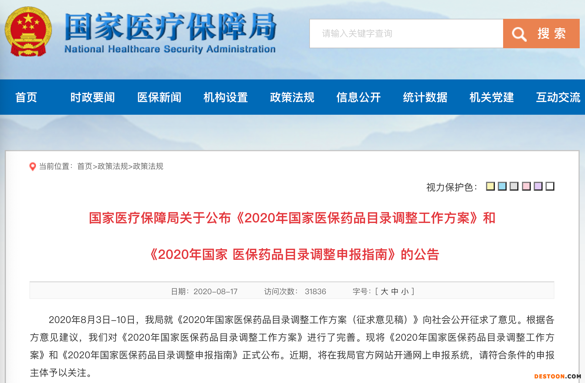 8月18日訊 2020年8月3日-10日,國家醫(yī)療保障局就《2020年國家醫(yī)保藥品目錄調(diào)整工作方案(征求意見稿)》向社會(huì)公開征求了意見。8月17日,《2020年國家醫(yī)保藥品目錄調(diào)整工作方案》和《2020年國家醫(yī)保藥品目錄調(diào)整申報(bào)指南》正式公布。