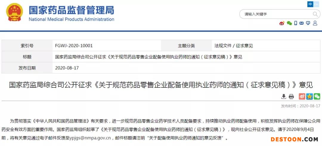 8月18日訊 8月17日,國家藥品監(jiān)督管理局發(fā)布《關(guān)于規(guī)范藥品零售企業(yè)配備使用執(zhí)業(yè)藥師的通知(征求意見稿)》(以下簡稱《征求意見稿》)。