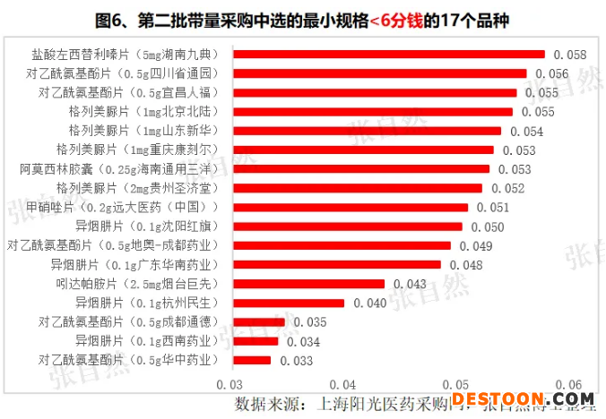 廣東的報量之所以最大,與其部分品種的報量特大有關(guān),如廣東枸櫞酸西地那非片的報量就占了全國報量的近七成。盡管本次集采最高有效申報價定的并不算低、且延續(xù)第二批“’單位可比價’≤0.1000元”即可中選的規(guī)定,以防止唯低價是取的風氣蔓延,但基于“第一順位企業(yè)優(yōu)先在供應地區(qū)中選擇1個地區(qū)”的規(guī)定,類似廣東這種超大報量的省份仍給企業(yè)帶來了特別的誘惑,企業(yè)已不只滿足于中標即可,而試圖用最低價去搏“供應地區(qū)中選擇1個地區(qū)”的優(yōu)先權(quán),從而獲得報量最大的省份的銷售權(quán)。此前在第二批帶量采購總共100個中選的品種中,價格戰(zhàn)也十分激烈,有30個品種最小值規(guī)格價格低于0.1元,其中17個最小規(guī)格價格低于6分錢(圖6)。