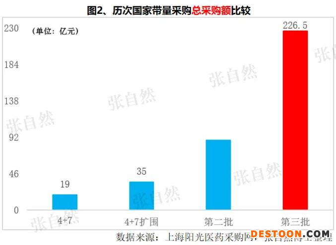 隨著報量的不斷增大,其對應的采購額也相應增加,由“4+7”的19億元、“4+7”擴圍的35億元、第二批的88億元,一直增加到第三批集采的226.5億元,較最初“4+7”的也增加了11倍多(圖2)。如果說“4+7”作為試點對藥企的影響還僅限于精神上的話,從第三批開始,帶量采購將成為醫(yī)藥行業(yè)不可回避的主流事件。